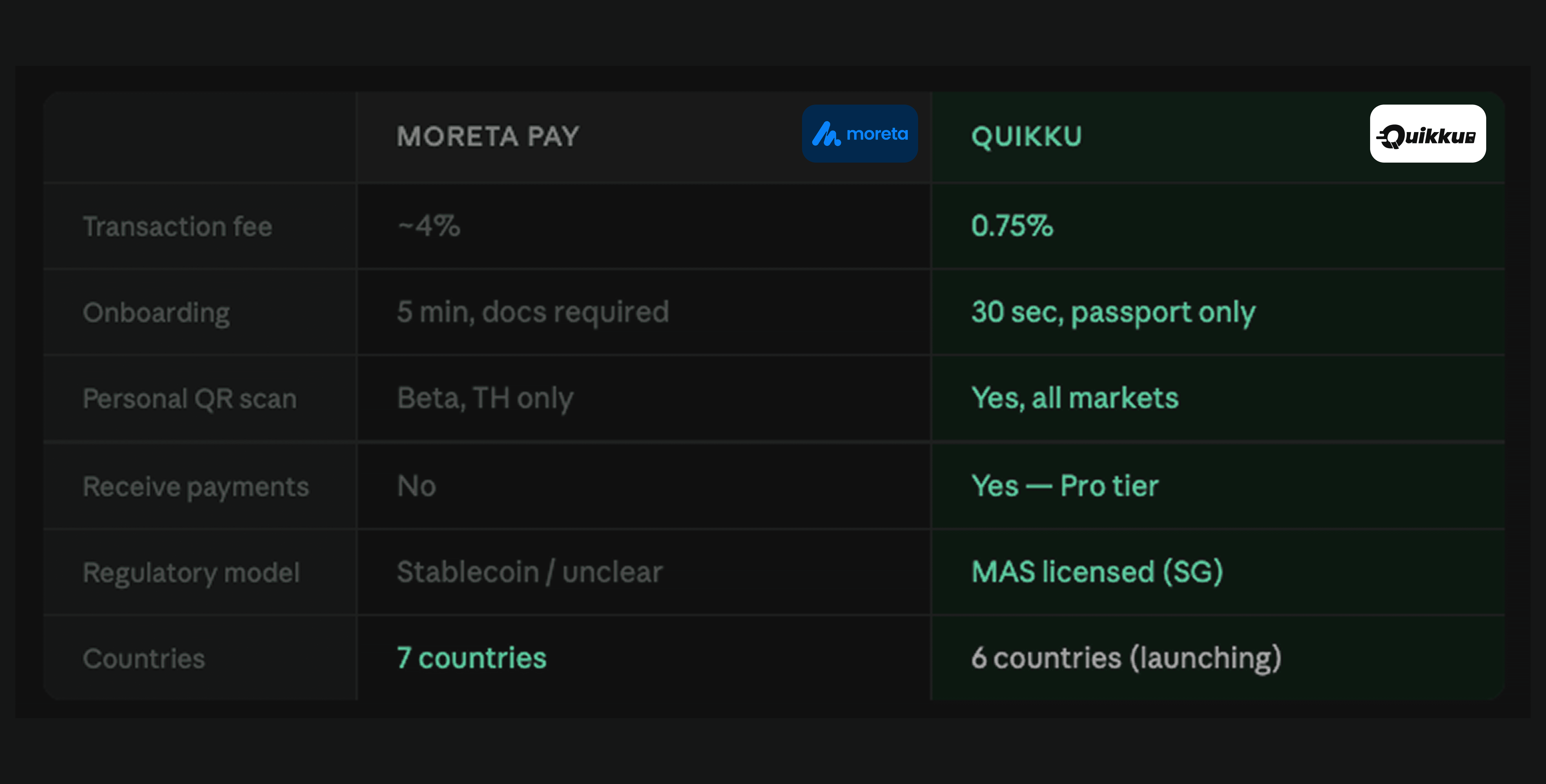 The closest competitor in the market charges ~4% per transaction and requires 5 minutes of document uploads to onboard. Quikku is 81% cheaper, onboards in 30 seconds with a passport scan only, and operates under Singapore MAS licensing — not a stablecoin model.