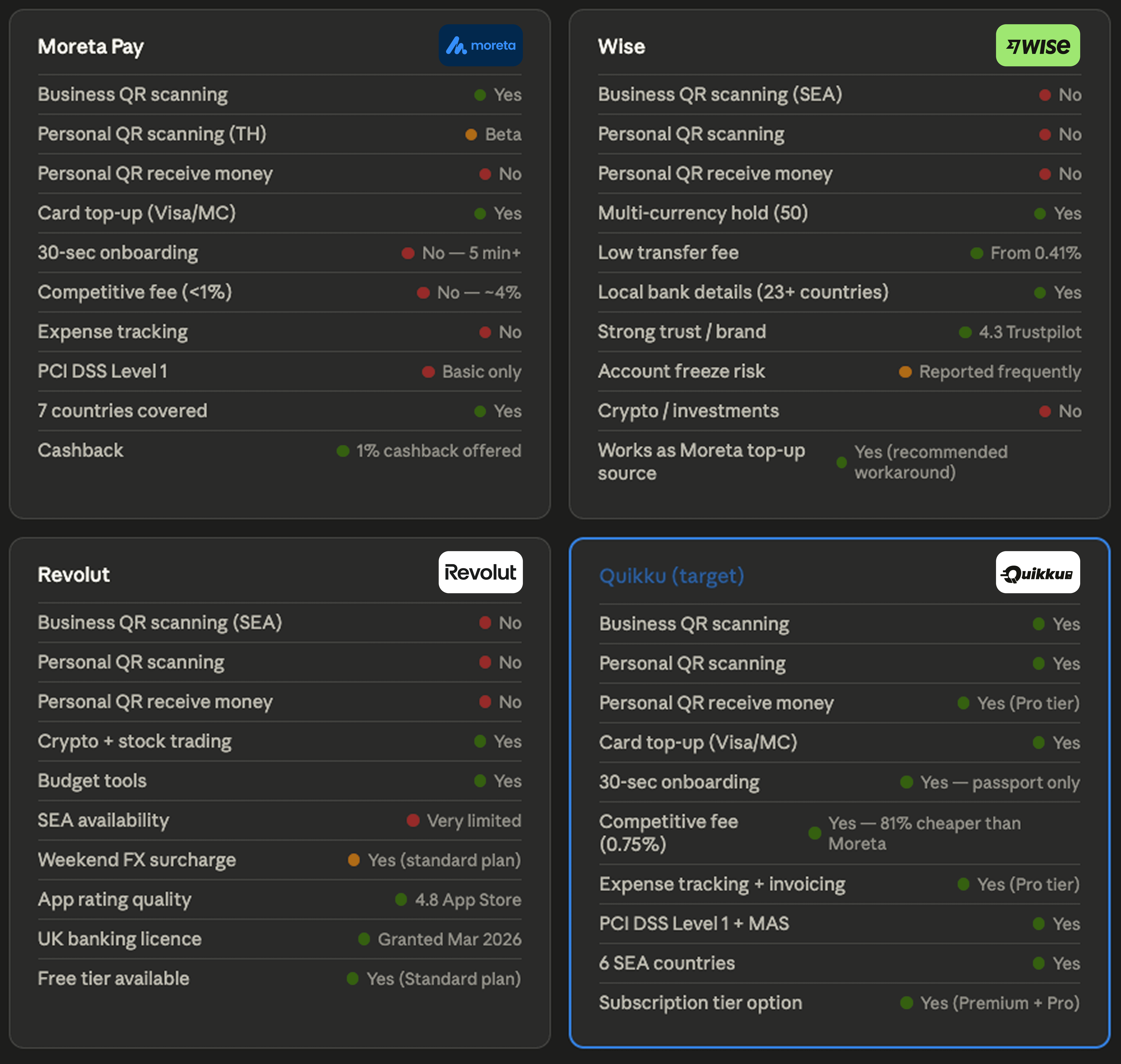Every major alternative either lacks QR scanning entirely or carries friction that disqualifies it for the tourist use case — slow onboarding, weekend FX surcharges, limited SEA availability, or unclear regulatory standing. Quikku is the only product in the audit with full marks across QR scanning, 30-second onboarding, competitive fees, and MAS-grade security.