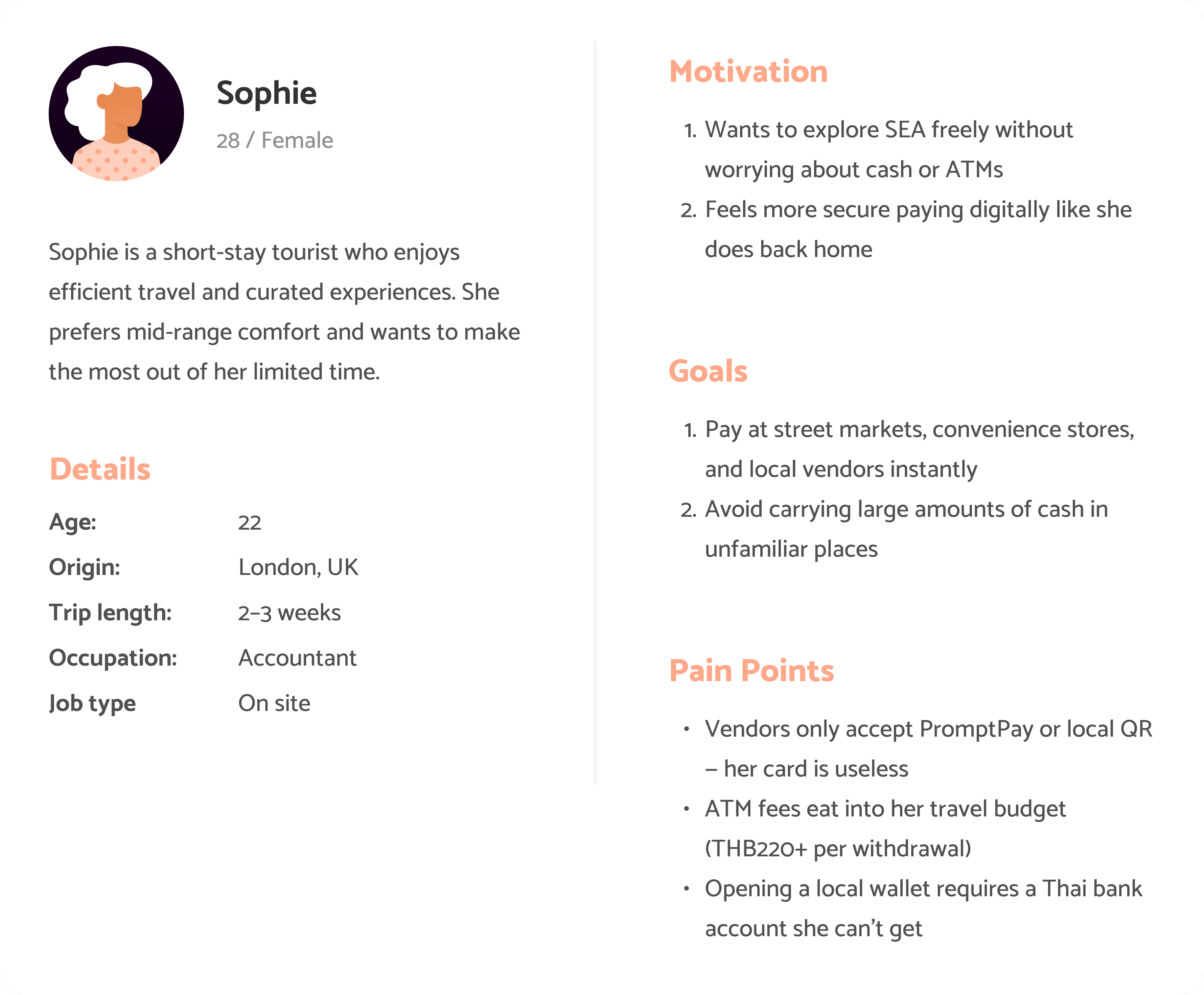 A 22-year-old accountant from London. 2–3 weeks in SEA. Wants to pay locally — can't. Her UK Mastercard is useless at every QR-only vendor.