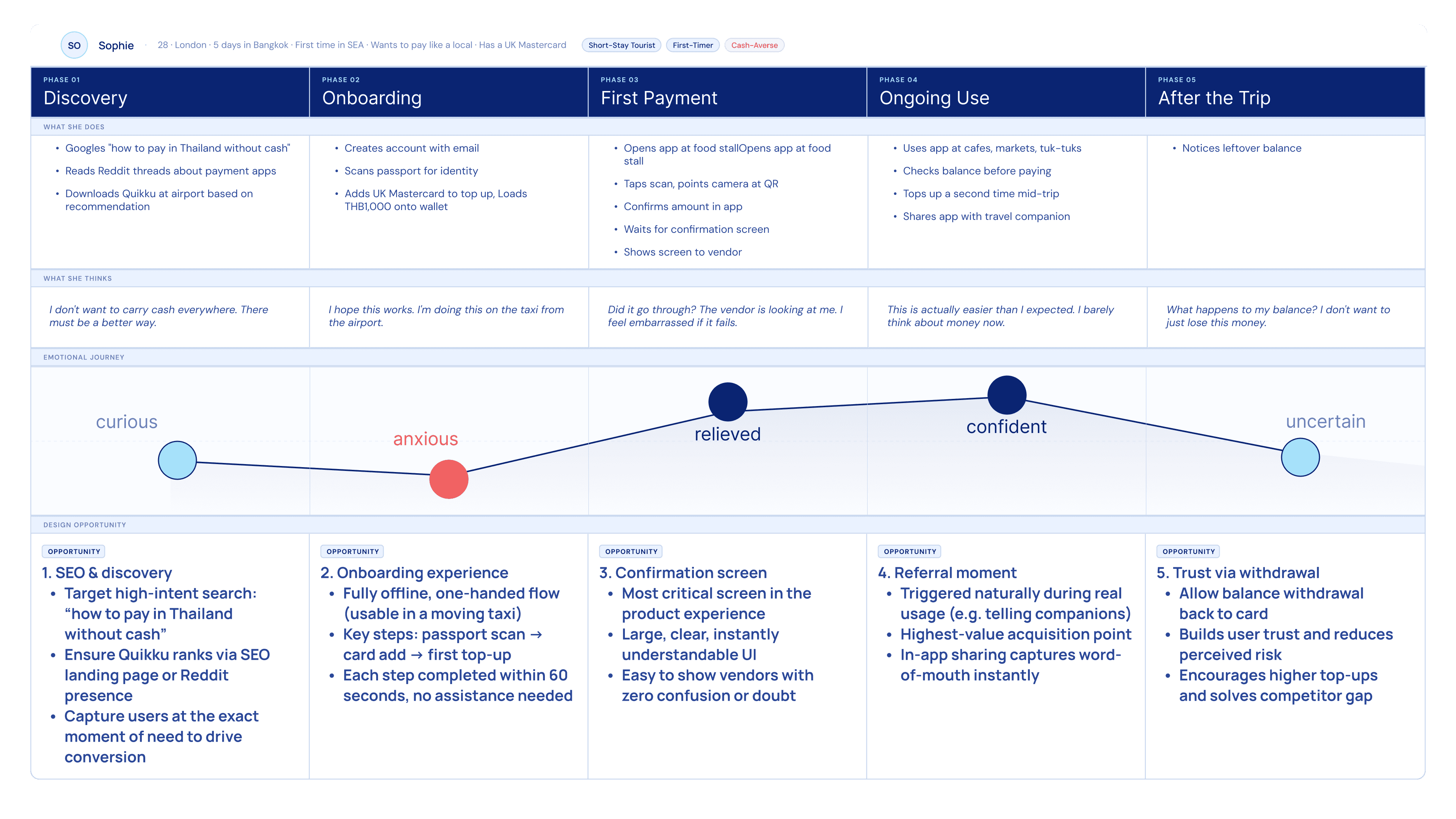 Anxiety peaks at onboarding. Relief lands at the confirmation screen. The emotional curve maps exactly where Quikku has to earn trust — and where it does.