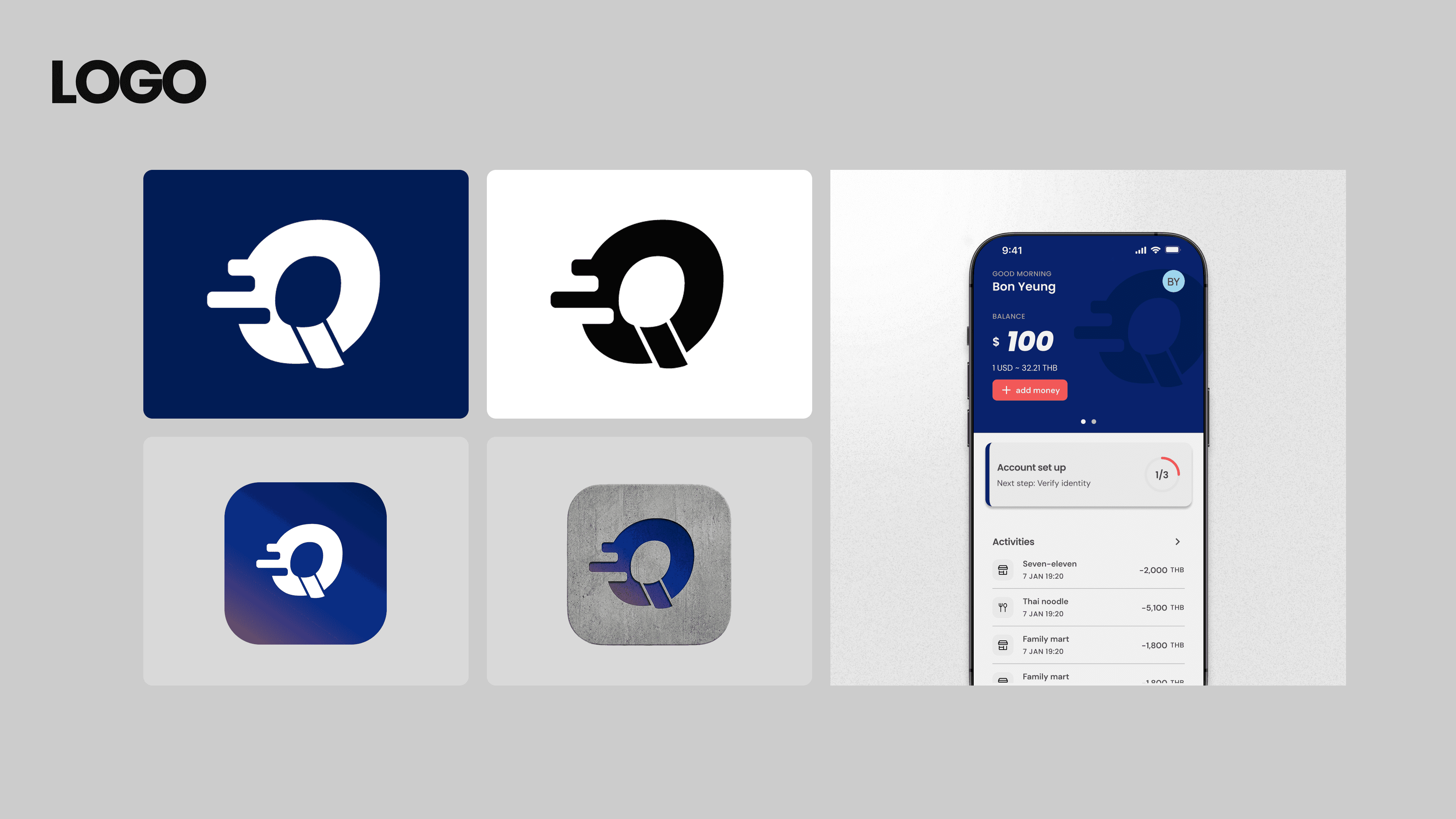 A Q letterform with speed lines — an icon-only mark that communicates instant payment without needing a single word. Clean, bold, and built to work at any size.